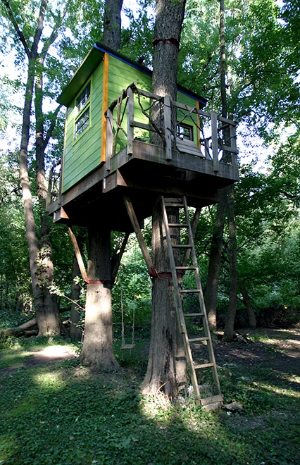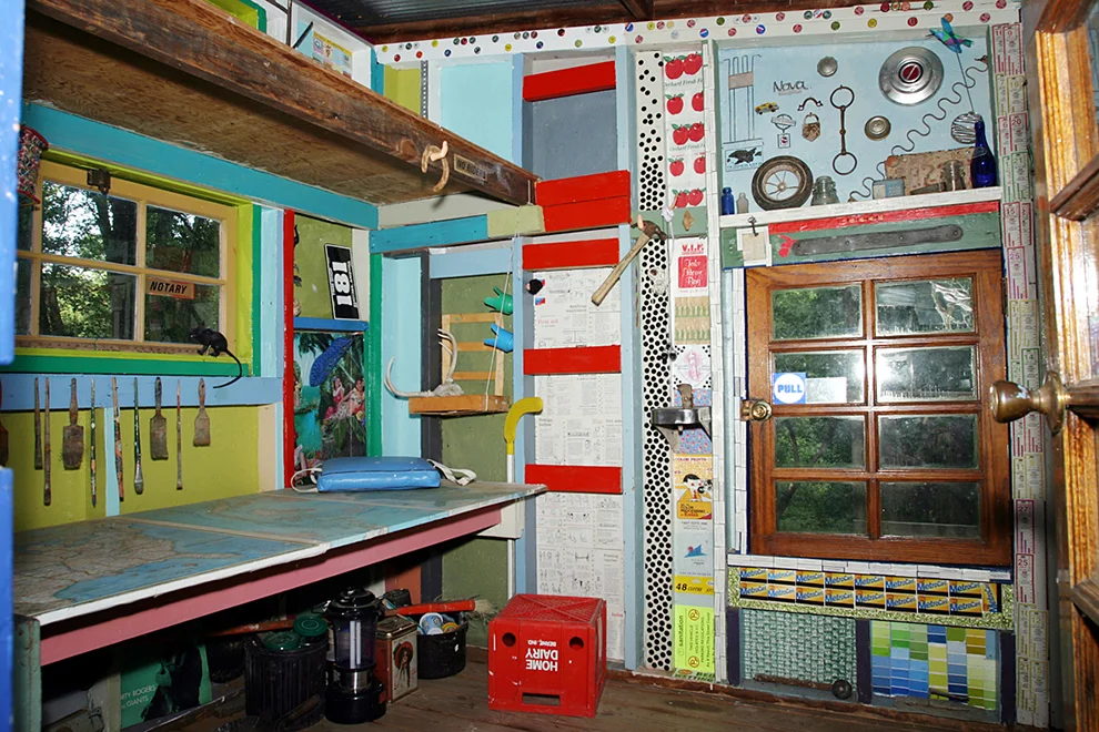 Ali Douglass was born in Muncie, Indiana and at sixteen built a treehouse in the woods with salvaged materials. She continued to work on it until she was 26, until each wall was a piece of art reminiscent of Pee-Wee’s Playhouse. The neighbors didn’t really like it, but she didn’t mind.